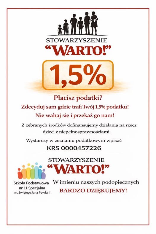 Drodzy Państwo, z całego serca dziękujemy za każdą formę wsparcia naszego Stowarzyszenia. Dzięki Państwa życzliwości i zaangażowaniu Stowarzyszenie „Warto!” może realnie działać na rzecz dzieci z niepełnosprawnością, wspierając ich rozwój, pasje i codzienne szkolne doświadczenia. Zwracamy się z serdeczną prośbą o przekazanie 1,5% podatku na rzecz Stowarzyszenia. To drobny gest, który dla naszych uczniów ma ogromne znaczenie.