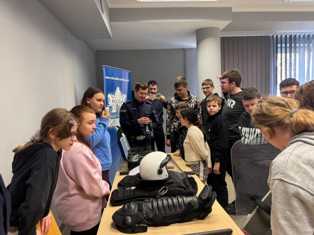 Uczniowie klas 5bu, 6bu, 8cu oraz 8bu, w ramach realizacji innowacji pedagogicznej: „Lepiej zobaczyć coś raz, niż słyszeć o tym tysiąc razy – spacerem po Rudzie Śląskiej” odwiedzili Komendę Miejską Policji w Rudzie Śląskiej.