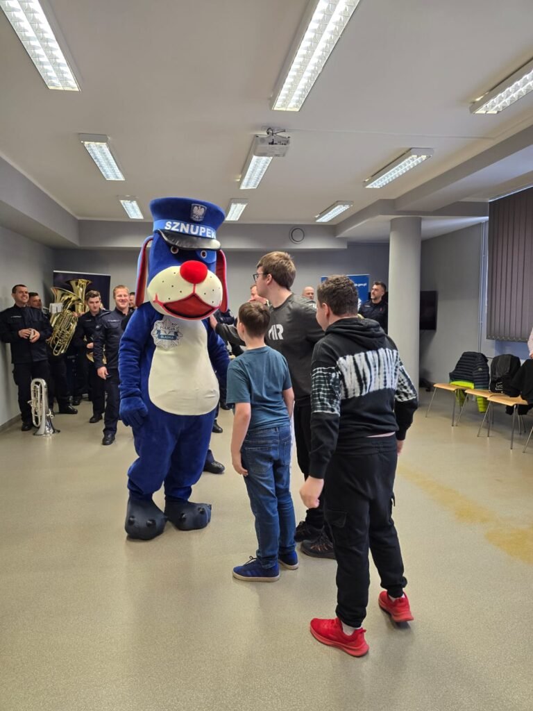 Po części warsztatowej czekała na nas wyjątkowa niespodzianka – koncert orkiestry policyjnej, który porwał wszystkich do tańca! Towarzyszyły mu wspaniałe maskotki: Wiewiórka oraz Sznupek, które dodatkowo rozbawiły i zaangażowały uczniów.